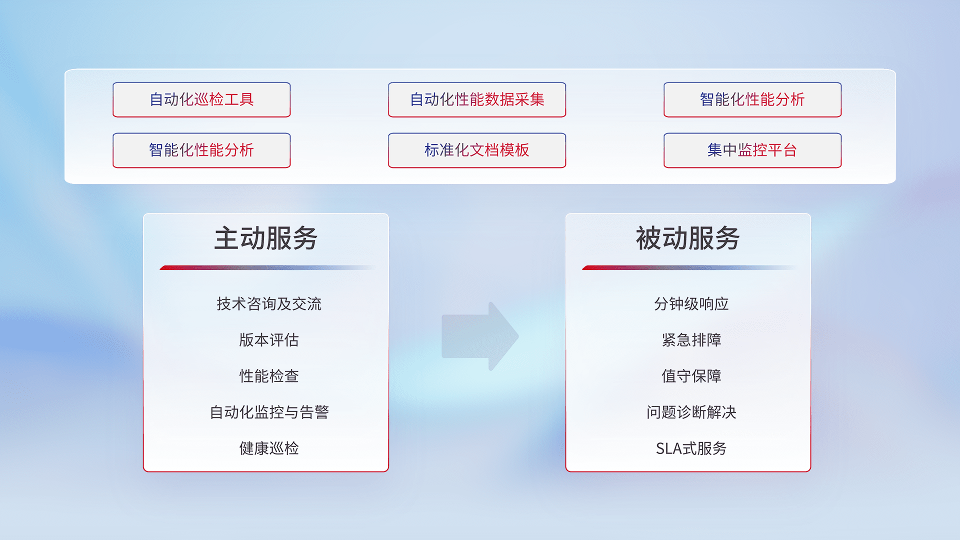 智能化工具和标准化文档,,,,保障服务质量,,,,提供主动服务(包含技术咨询、、版本评估、、、性能检查、、、自动化监控与告警、、、、健康巡检)和被动服务包含(分钟级响应、、、、紧急排障、、、值守保障、、、问题诊断解决、、、SLA服务)。。。。